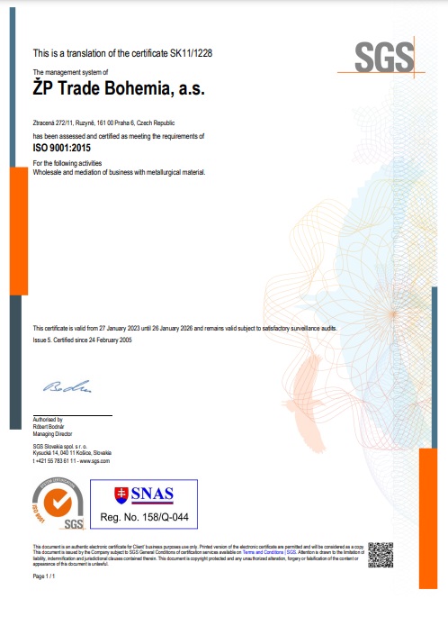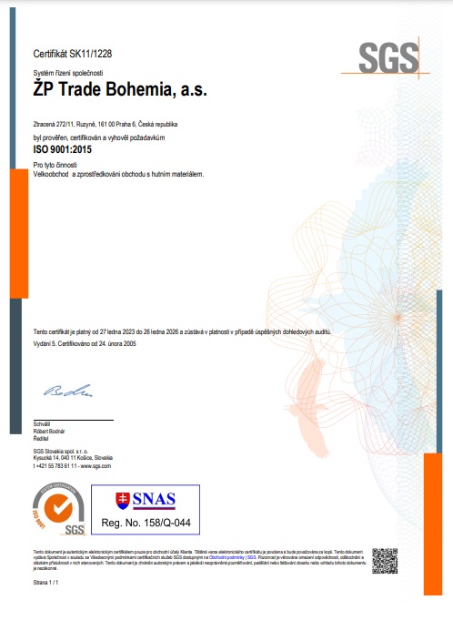 Systém řízení kvality je v ŽP Trade Bohemia certifikován podle ISO EN 9001:2015