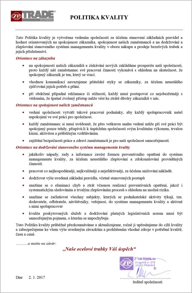 Tato Politika kvality je vytvořena vedením společnosti za účelem stanovení základních pravidel a hodnot orientovaných na spokojenost zákazníka, spokojenost našich zaměstnanců a na dodržování a zlepšování stanoveného systému managementu kvality v oboru nákupu a prodeje bezešvých trubek a jejich příslušenství.